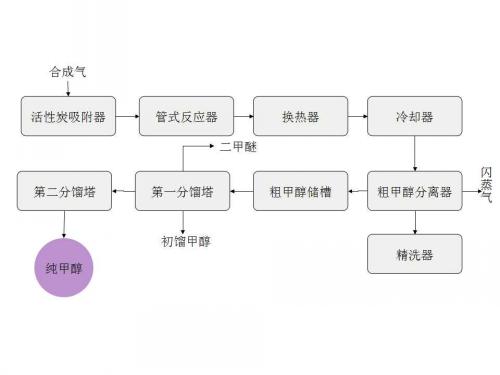 合成氣經活性炭吸附器后進入管式反應器中,反應生成粗甲醇。含粗甲醇的氣體經冷卻器冷卻后,迅速進入粗甲醇分離器中,使粗甲醇冷凝。冷凝的粗甲醇進入精餾裝置,在第.一分餾塔中分出二甲醚和甲酸甲酯及其它低沸點不純物,在第二分餾塔里除去水和雜醇,得到精甲醇。