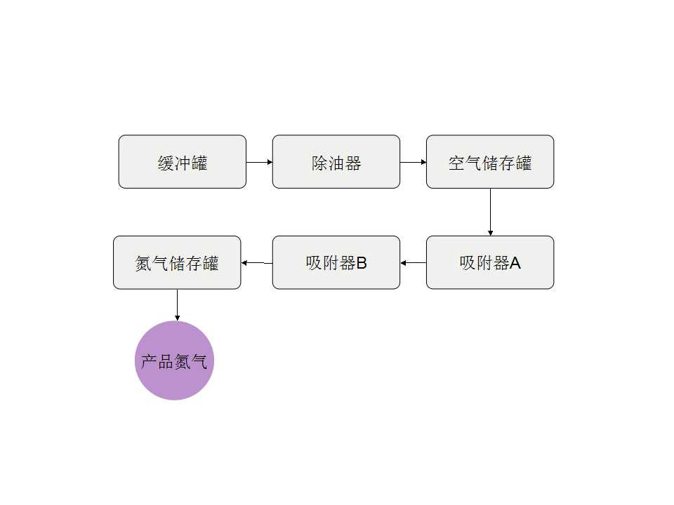 變壓吸附裝置是利用壓縮空氣為原料,采用變壓吸附原理和技術(shù)制取所需氮?dú)獾脑O(shè)備。變壓吸附裝置采用碳分子篩為吸附劑,一定的壓力下,碳分子篩對空氣中的氧的吸附遠(yuǎn)大于氮,A、B兩塔可以交替循環(huán),加壓吸附、減壓脫附,完成氧氮分離,得到所需純度的氮?dú)狻?/span>