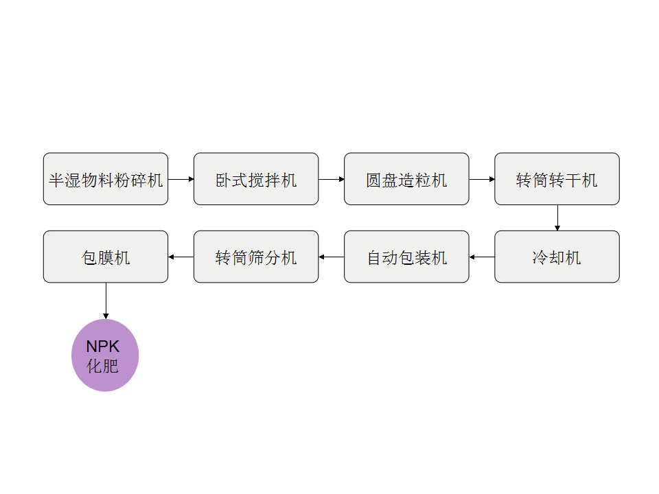 復合肥的生產(chǎn)工藝主要是以單體的基礎肥料(尿素、硝銨、氯化銨等)為原料,經(jīng)粉碎至一定細度后,物料在造粒機的滾動床內(nèi)通過增濕、加熱進行團聚造粒,在成粒過程中,有條件的還可以在造粒機加入少量的磷酸和氨,以改善成粒條件。造粒物料經(jīng)干燥、篩分、冷卻即得到NPK復合肥料產(chǎn)品。
