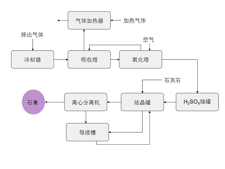 燃燒氣體在冷卻器中被冷卻到50-70℃,送入吸收塔,由上部來的稀硫酸將SO2氣體吸收除去入大氣。稀硫酸中的SO2在氧化塔內(nèi)生成硫酸,返回吸收塔。一定量的稀硫酸在結(jié)晶罐內(nèi)生成石膏,石膏經(jīng)過離心分離機(jī)后與母液分開。母液由母液槽返回到吸收塔,石膏結(jié)晶進(jìn)行脫水,直到容易處理的程度為止。